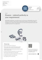 services - finance dmg mori used machines sales / cnc scout finance / insurance buy-back reconditioning dmg mori used machines first choice second hand services finance, trade-ins, machine insurance. services finance – tailored perfectly to your requirements. dmg mori used machines is the perfect partner for financing your dmg mori machine. be it leasing, hire purchase or rental, we have a tailored finance model for every business. with our knowledge of your machine and its applications, we are able to provide optimised solutions with a suitable finance offer from a single source. 06 financing + machines and finance from a single source + better customer advice, a simple dialogue between qualified representatives and the manufacturer’s technology experts + tailored, tried-and-tested and flexible financing concepts calculated based on frequency of use + individual contractual structuring based on the volume of orders + rapid response times through close communication you can find more information on finance for your used machine on our homepage or at dmg mori used machines gmbh: + fixed costs that can be planned throughout the term of the contract usedmachines.dmgmori.com + unaffected by fluctuations in the capital market + fair settlement at the end of the contract