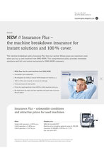 services - insuranceplus you can also find all of the details online at: insuranceplus.dmgmori.com services new // insurance plus – the machine breakdown insurance for instant solutions and 100 % cover. the machine breakdown policy insurance plus from our partner allianz gives you maximum cover when you buy a used machine from dmg mori. this comprehensive policy provides immediate assistance and full cost control exclusively for dmg mori customers. + new: now also for used machines from dmg mori a product by: + immediate claim settlement + no obligation to notify in case of shift changes ≤ 4 months p. a. + 100 % of the cost covered, no excess for damage + fixed premiums for 36 months + prices for used machines: from 4.90 ‰ of the machine price p.a. + no deductions for wear and tear (spindles and parts with a service life ≥ 5 years) 07 insurance plus – unbeatable conditions and attractive prices for used machines. rates single-shift operation = 4.90 ‰ p.a. 2-shift operation = 5.38 ‰ p.a. 3-shift operation = 5.61 ‰ p.a. sample price dmu 60 monoblock® machine price including optional extras: € 240,000 insurance: € 240,000 × 4.90 ‰ = € 1,176 (per year plus vat) requirement for insurance plus: conclusion of a service plus contract (inspection plus, maintenance plus or service competence plus) or attendance of a ‘mechanics’ service training session at dmg mori. the insured and the machine location must be in germany.