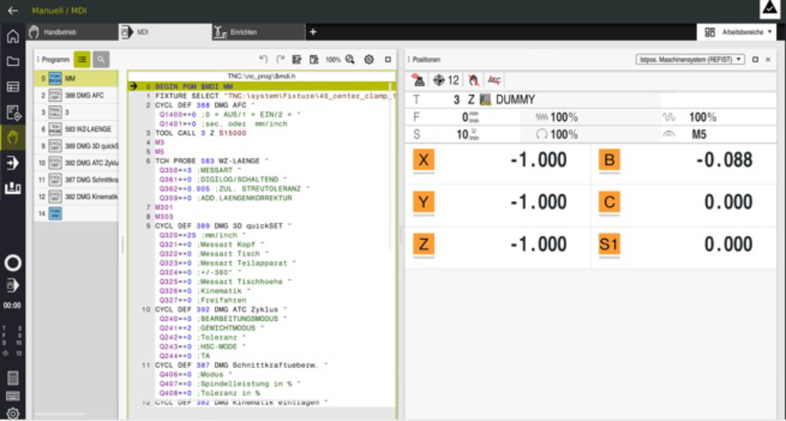 NC programs can be created, tested, and optimized on a PC using HEIDENHAIN software. Every menu and button corresponds to the real machine layout. Programs can be created in HEIDENHAIN plain text dialog, DIN/ISO, or with graphical support and the proven TNC functions. Contours can be imported from standardized CAD formats (DXF, STEP, IGES). Externally created programs, such as those from CAM systems, can be checked and adjusted if necessary. Optionally, the programming station (TNC7) can be equipped with a digital twin.
